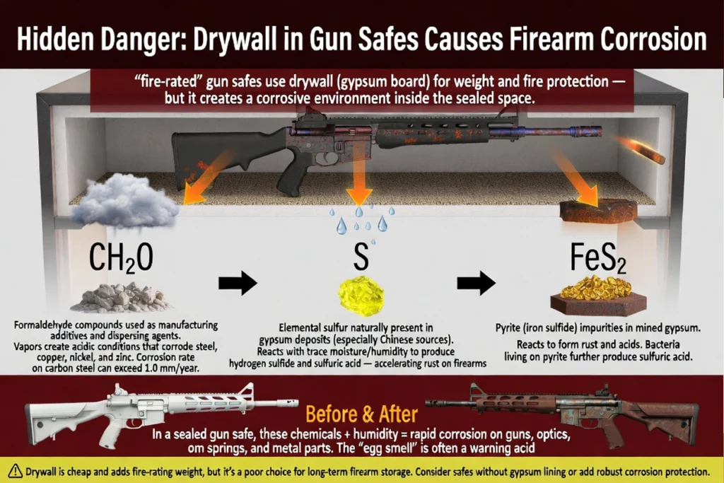 Beyond performance limitations, drywall introduces a long-term risk for firearm storage. Gypsum can release moisture and sulfur compounds over time, especially in a sealed steel enclosure. These can create a corrosive micro-environment that attacks barrels, springs, optics mounts, and other metal components — even when no fire ever occurs.