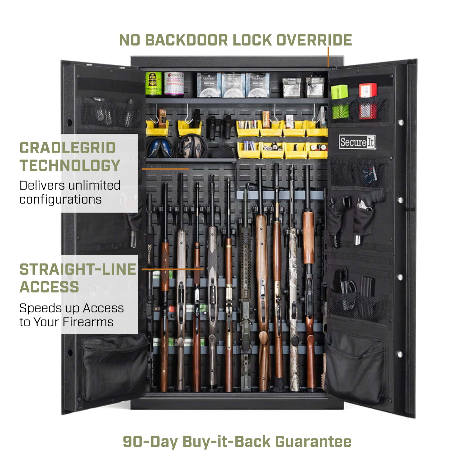 Built within SecureIt’s Answer Modular System, the Model 12 Pro is designed for customization. Its CradleGrid™ back panel lets you tailor storage for rifles, handguns, and accessories without tools, adapting to your collection’s needs. Whether you’re a collector, sport shooter, or home defender, this safe combines traditional strength with modular versatility.