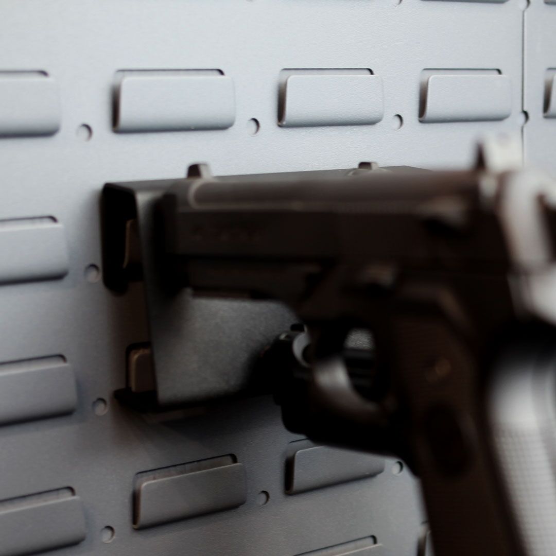 This pistol rack features brass pegs that won’t damage the rifling in your barrel and fits .22 caliber pistols. It also comes with 4 black vinyl peg caps for a snug fit with higher calibers. The 4 Pistol Peg Rack can be used in all SecureIt gun safes, conversion kits, and gun wall panels due to CradleGrid™ Technology, and can also fit in the SecureIt Fast Box™ for fast access.
