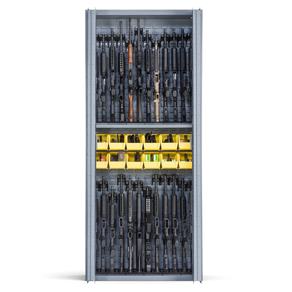 The Model 84 24/24 cabinet properly stores 24 rifles and 24 handguns. It also includes 12 large bins with removable dividers that may be repositioned anywhere on the grid to store optics and gear.