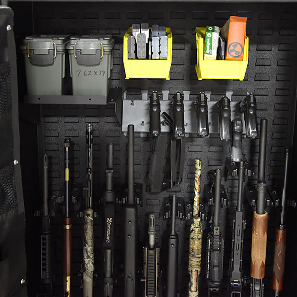 Max out your gun storage with the High-Density Gun Storage Kit. This kit allows you to store more gear and accessories with your firearms and it works with all Agile™ and Answer™ models, Military Grade Gun Cabinets, Custom Gun Walls, and the TRUE™ Safe.