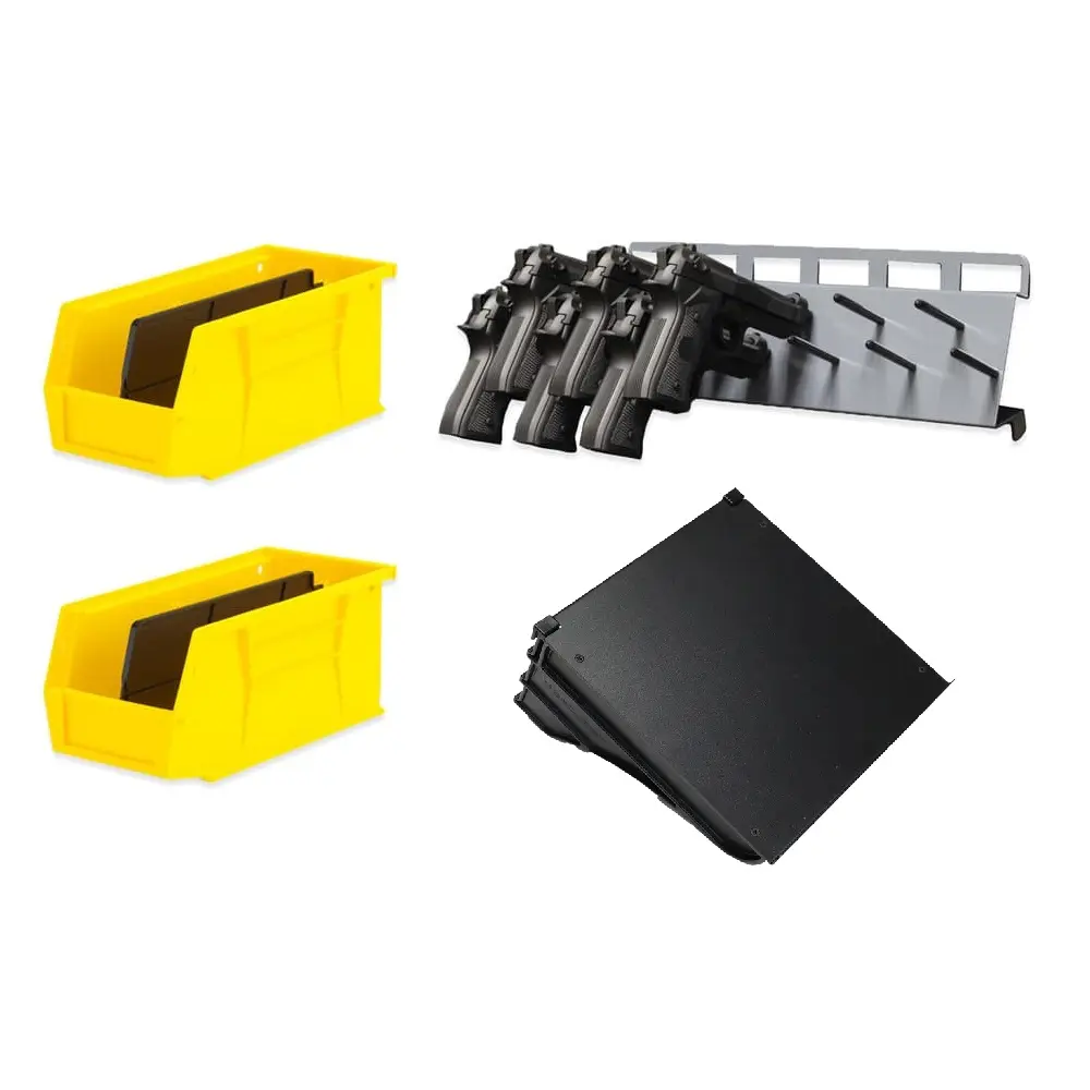 One (1) Rifle and Gear Shelf – 4-Gun Storage (SEC-SBS-04-01) One (1) Pistol Peg Rack – (SEC-52-628) Two (2) Large Bins w/ Dividers (B6115-Y)