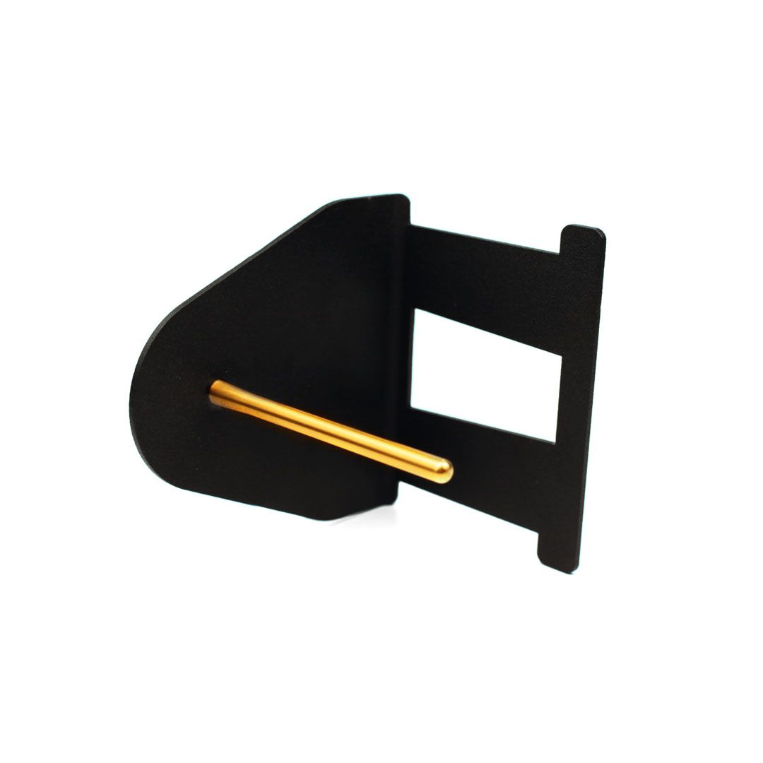 The Universal Display Pistol attaches to one CradleGrid™ louver and enables storage of a .22 caliber pistol or larger. The pistol peg adjusts on the fly to display to a single handgun in either the left- or right-hand position. With the peg facing to the side, it allows for a more polished display of your favorite handgun. The steel material and powder-coated black finish enforce its durability, and it features a brass peg that will not damage the rifling in your barrel. The brass peg alone fits .22 caliber pistols. This product also comes with a black plastic peg cap which allows for a snug fit with higher caliber pistols.